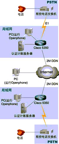 組成這個IP電話的網(wǎng)絡(luò)系統(tǒng)由處于兩個不同國家的區(qū)域組成(見附圖1網(wǎng)絡(luò)拓?fù)浣Y(jié)構(gòu)),每個區(qū)域都采用了一臺Cisco 5350路由器(以下簡稱5350)作為網(wǎng)絡(luò)的核心,這臺5350路由器具有兩個WAN口和兩個以太網(wǎng)口,能夠直接連接到本地的局域網(wǎng)和DDN基帶調(diào)制解調(diào)器。和普通電話網(wǎng)絡(luò)(PSTN)相連接則是通過添加一個E1接口卡4PRI和一個IP語音數(shù)據(jù)處理單元NP60,來實(shí)現(xiàn)E1(30條ISDN的B信道)和路由器相連接,實(shí)時地對語音數(shù)據(jù)進(jìn)行H.323壓縮編碼。