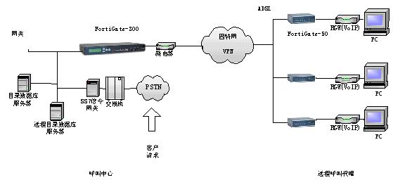 呼叫中心和代理之間傳輸可以選用寬帶高速ADSL網(wǎng)絡,構(gòu)成以一個呼叫中心和眾多遠端通信的綜合語音/數(shù)據(jù)VPN網(wǎng)絡。VoIP/Data ADSL VPN網(wǎng)絡是呼叫系統(tǒng)的解決辦法,它要求系統(tǒng)的性能好,穩(wěn)定性和可靠性高,語音質(zhì)量好, 響應時間短,網(wǎng)絡配置和維護簡單方便。