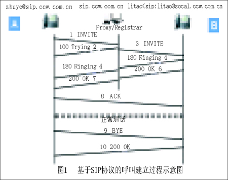 在Windows中內(nèi)置的NetMeeting就是典型的H.323協(xié)議客戶端,而比較常見的SIP系統(tǒng)是微軟開發(fā)的MSN Messenger系統(tǒng)。一個(gè)簡(jiǎn)單的SIP協(xié)議呼叫建立過程如圖1所示。