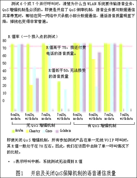 而當(dāng)我們通過一個(gè)接入點(diǎn)或交換機(jī)傳送6到7個(gè)并行VoIP呼叫時(shí),尤其是加入了數(shù)據(jù)通信業(yè)務(wù)后,所有產(chǎn)品的系統(tǒng)性能顯著降低。另外,當(dāng)開通7個(gè)并行VoIP呼叫和關(guān)閉QoS保障機(jī)制時(shí),即使沒有加入數(shù)據(jù)業(yè)務(wù), Colubris設(shè)備也幾乎都處于通話中斷的狀態(tài)。因此,我們無法得到任何測試數(shù)據(jù)(如圖1所示)。
