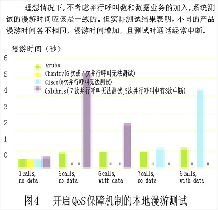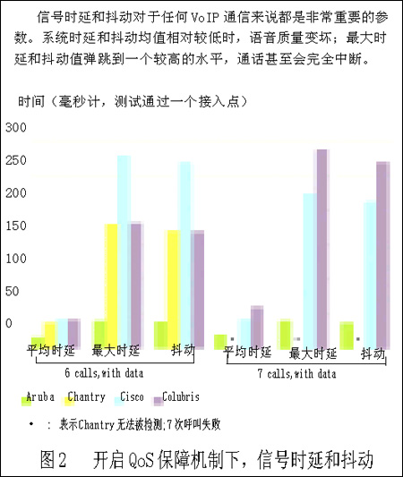 在關(guān)閉QoS保障機(jī)制時(shí),Chantry和Colubris系統(tǒng)在承載7個(gè)并行VoIP呼叫時(shí),所有的通話都中斷,不能進(jìn)行有數(shù)據(jù)流業(yè)務(wù)加入的VoIP語音測試。