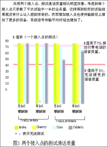 而其他供應(yīng)商的設(shè)備在開啟QoS保障機(jī)制的情況下,一旦加入數(shù)據(jù)流業(yè)務(wù),就很難保證通話質(zhì)量。從正面來看,在只有語音傳輸業(yè)務(wù)的情況下,QoS保障機(jī)制一般運(yùn)行較好。當(dāng)我們只承載語音傳輸時(shí),所有系統(tǒng)的音頻質(zhì)量都改善了。在不加入數(shù)據(jù)流情況下測試6個(gè)或7個(gè)并行VoIP呼叫,所有的系統(tǒng)都能夠取得和付費(fèi)電話一樣的通話質(zhì)量。但當(dāng)我們加入數(shù)據(jù)流業(yè)務(wù),一切都改變了。在承載6個(gè)并行VoIP呼叫并加入數(shù)據(jù)流業(yè)務(wù)的情況下,Colubris CN1250系統(tǒng)的R值衰落到70以下。根據(jù)ITU的R值標(biāo)準(zhǔn),這說明一些用戶的通話質(zhì)量不令人滿意。Chanrty的R值在60左右,這個(gè)結(jié)果將不能令用戶滿意。除了客觀的R值評(píng)分以外,我們還進(jìn)行了一些主觀的通信質(zhì)量監(jiān)聽,當(dāng)加入了數(shù)據(jù)流業(yè)務(wù)以后,我們聽到了大量的回聲,掉線頻繁。總之,只要測試點(diǎn)加入數(shù)據(jù)業(yè)務(wù)流,上面描述的情況就會(huì)出現(xiàn),通話質(zhì)量通常變得惡劣。