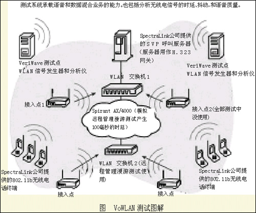 這次試驗(yàn)搭建了有著自己鮮明特點(diǎn)的VoWLAN試驗(yàn)系統(tǒng)。該系統(tǒng)包括兩個(gè)802.11b接入點(diǎn)適配設(shè)備和一部連接到接入點(diǎn)的交換機(jī)以及路由設(shè)備,還有14個(gè)WLAN手持終端設(shè)備和SpectraLink公司提供的SVP呼叫服務(wù)器(服務(wù)器用做H.323網(wǎng)關(guān))。另外,VeriWave公司提供了實(shí)驗(yàn)的測試設(shè)備。我們還在漫游測試項(xiàng)目中使用了由Spirent公司提供的信號(hào)損傷發(fā)生器。