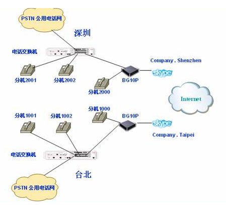 如圖,如果臺北辦公室的一個員工(分機 1001)想與深圳辦公室的一個員工(分機2001)通話,他(她)僅需要撥打1000號分機,就會聽到“請輸入分機號碼”的提示,他(她)然后輸入2001就可以通話了。是不是比打國際長途省事多了呢?當(dāng)然還更省錢。