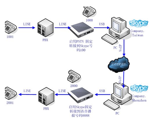 Shenzhen),深圳側(cè)的ITA 檢測到Skype(Company. Shenzhen)有呼叫進入,將該VoIP呼叫Forward到8888語音引導(dǎo)號碼,此時臺北辦公室的員工將聽到“請輸入分機號碼”的提示,他(她)然后輸入2001,交換機將該呼叫轉(zhuǎn)接到分機2001,臺北與深圳就可以通話了。