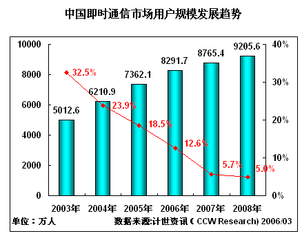 即時通訊巨大的市場價值主要來自三方面,除了能夠增加門戶網(wǎng)站的用戶的黏性,即時通訊能夠帶來巨大的用戶和網(wǎng)絡通訊巨大的市場。根據(jù)計世資訊《2005-2006年中國VoIP業(yè)務發(fā)展趨勢研究報告》相關(guān)數(shù)據(jù)顯示,2005年中國即時通訊用戶達到7362.1萬人,增長率為18.5%,2005年中國即時通訊市場規(guī)模達到16.2億元,實現(xiàn)37.3%的增長率。