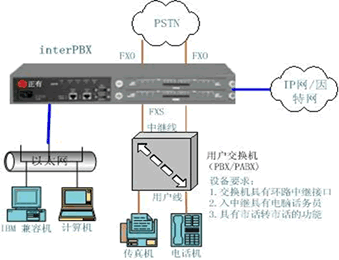 根據(jù)電話交換機的配置和功能不同,電話交換機與 interPBX設備的連接方式有二種常見方式,下面結合示意圖來具體說明。