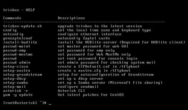 理論上,在安裝完成之后,用戶即可通過Web界面進行配置,但是我們強烈建議用戶首先登錄進入命令行界面,修改各組件相關(guān)的各個口令。使用help-trixbox功能,即可訪問Trixbox主要組件的管理、升級、維護和配置腳本,如圖1所示。其中,以“passwd”為開始的命令用于修改各主要管理界面的口令。此外,對于安裝了FXS/FXO語音卡的用戶,需要首先運行g(shù)enzaptelconf腳本,生成基本的zaptel配置文本。需要提醒的是,用戶應(yīng)該慎用yum-update命令,因為該命令只對CentOS進行常規(guī)更新,有可能會改變Asterisk相關(guān)的配置文件,使Asterisk在系統(tǒng)重新啟動之后無法正常運行。