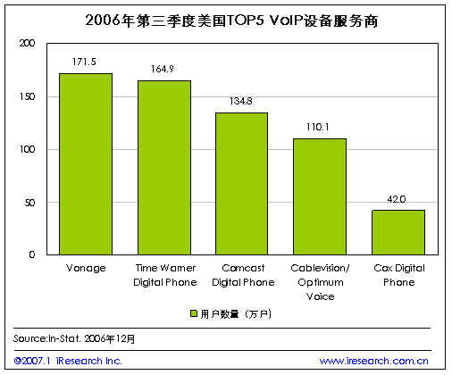 iResearch艾瑞市場咨詢根據(jù)In-Stat的統(tǒng)計數(shù)字整理發(fā)現(xiàn),目前在美國VoIP市場中,以VoIP設(shè)備為服務(wù)基礎(chǔ)的服務(wù)提供商的用戶數(shù)量來看,占市場主導(dǎo)位置的五大服務(wù)商為Vonage、Time Warner、Comcast、Cablevision/Optimum和Cox.