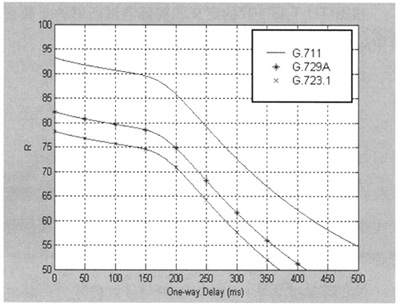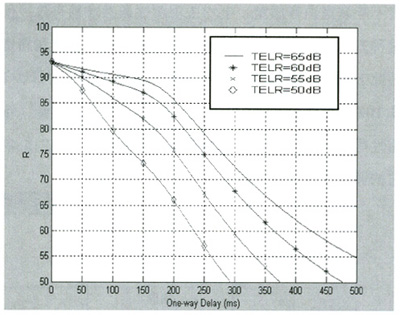 Datagram Protocol)協(xié)議進(jìn)行傳輸[1]。近年來(lái),隨著IP網(wǎng)絡(luò)技術(shù)的廣泛應(yīng)用,VoIP成為一種新興的電話通信方式,IP網(wǎng)絡(luò)所提供的語(yǔ)音質(zhì)量問(wèn)題受到人們的普遍關(guān)注,如何對(duì)語(yǔ)音質(zhì)量進(jìn)行科學(xué)可靠的測(cè)量和評(píng)價(jià)是網(wǎng)絡(luò)測(cè)量和網(wǎng)絡(luò)規(guī)劃設(shè)計(jì)中十分關(guān)鍵的問(wèn)題。E-Model作為語(yǔ)音質(zhì)量測(cè)量的一種新方法,它適合數(shù)據(jù)網(wǎng)絡(luò)的語(yǔ)音質(zhì)量測(cè)量,必將有廣泛的應(yīng)用。本文將在E模型下分析延時(shí)、噪聲、回音和語(yǔ)音壓縮等對(duì)VoIP語(yǔ)音質(zhì)量的影響。
