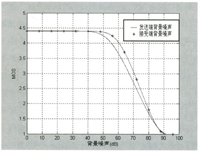 (3)從圖4仿真結(jié)果可以看出,發(fā)送端背景噪聲Ps和接收端背景噪聲Pr對(duì)MOS值的影響:背景噪聲小于40 dB時(shí),對(duì)語(yǔ)音質(zhì)量沒(méi)有太大的影響,當(dāng)背景噪聲大于40
