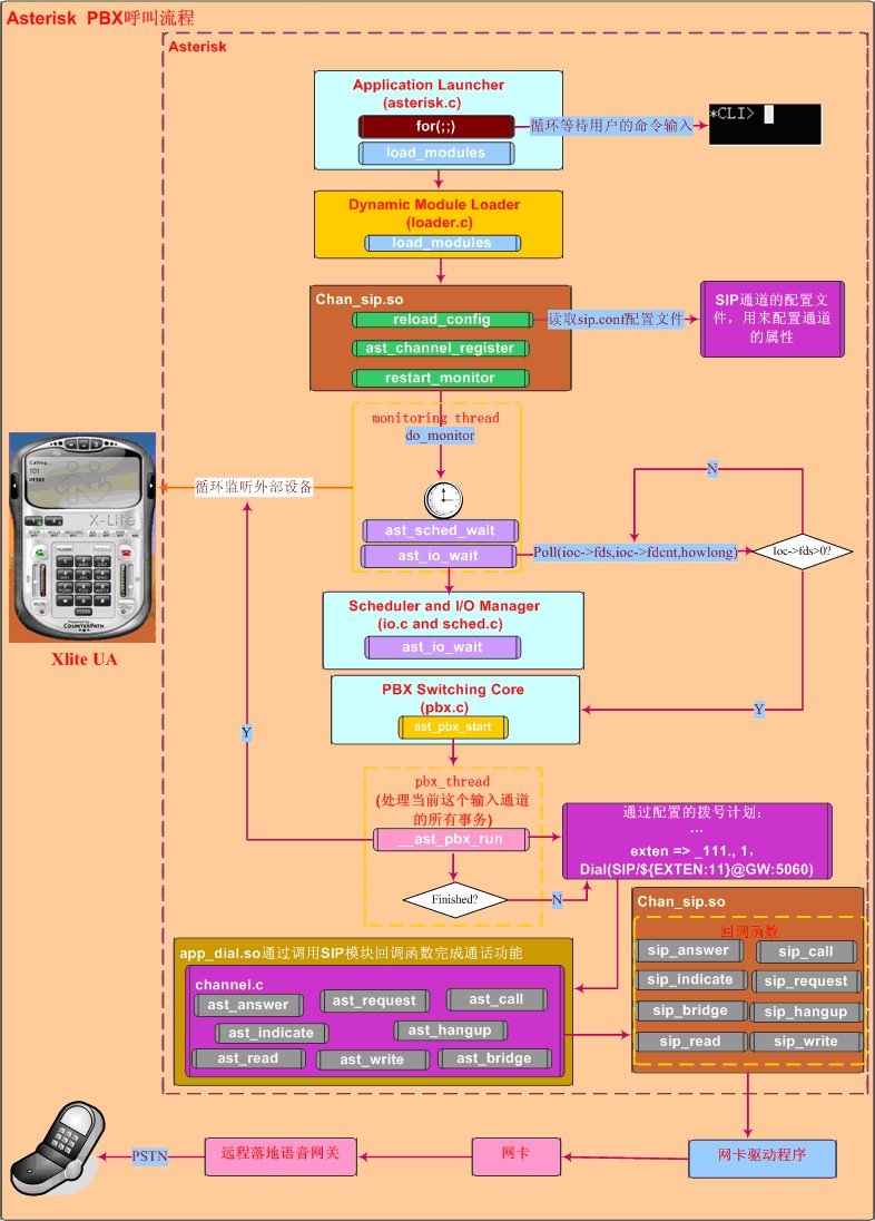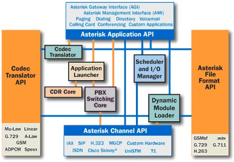 Asterisk具有傳統(tǒng)PBX無法比擬的優(yōu)點(diǎn),那就是其靈活性,可擴(kuò)展能力;Asterisk的擴(kuò)展能力是通過開放相應(yīng)的架構(gòu)和接口來實(shí)現(xiàn)的。這就意味著Asterisk是一個組件而不是一個成型的產(chǎn)品,Asterisk的核心提供了一個基本的可運(yùn)行環(huán)境,而外圍相應(yīng)的能力則可以通過加載和配置相關(guān)的插件和模塊來實(shí)現(xiàn)。