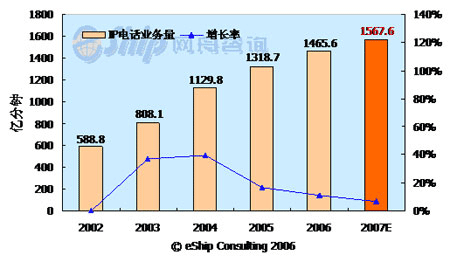 從圖中可以看出,國內IP電話市場近年呈現(xiàn)出快速增長趨勢,2002-2007年年均增長率為20.7%。預計2007年IP電話的通話時長將達到1567.6億分鐘,同比增長7%。但從2005年開始,IP電話的增長率呈下降趨勢,這主要是受管制限制和移動長途的替代作用所致。