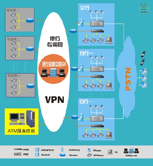 3、如上圖所示,已加裝了PBX的總行或分行,在以前的PBX上加裝GW,使得PBX通過GW進(jìn)入銀行的數(shù)據(jù)專網(wǎng)并注冊到GK,GK給其分配內(nèi)網(wǎng)的號碼,這樣在不淘汰原有設(shè)備的情況下,有PBX的依然可以與網(wǎng)內(nèi)的其他終端進(jìn)行零話費通話。
