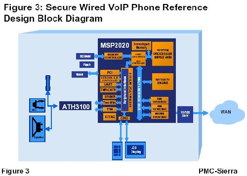PMC-Sierra的MSP2020是VoIP電話參考平臺的基礎(chǔ),可以使具備安全特性的VoIP產(chǎn)品在價(jià)格和性能上都達(dá)到新的高度。MSP2020不需要單獨(dú)的處理器、語音處理DSP、安全芯片以及多個(gè)以太網(wǎng)MAC,其全集成式設(shè)計(jì)簡化了電話設(shè)計(jì)復(fù)雜性,使整個(gè)產(chǎn)品成本(BOM)減少,可以讓OEM與服務(wù)提供商迅速向市場提供差異化VoIP電話產(chǎn)品。