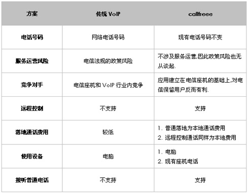 可以看到,callfreee方案主要在服務(wù)的成本與穩(wěn)定性、保留原來電話號碼以及多種設(shè)備的應(yīng)用等方面有了改變,并且?guī)缀醵际轻槍鹘y(tǒng)VoIP的不足來進(jìn)行的完善。對于這些不同,我們不妨以表格的形式來表現(xiàn),這樣更加一目了然。