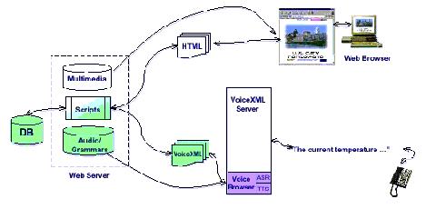 VoiceXml 1.0規(guī)范基于W3C的工業(yè)標(biāo)準(zhǔn)XML,為語(yǔ)音和電話應(yīng)用的開發(fā)者,服務(wù)提供商和設(shè)備制造商提供了一個(gè)智能化的API。VoiceXml的標(biāo)準(zhǔn)將簡(jiǎn)化WEB上具有語(yǔ)音響音服務(wù)的個(gè)性化界面的創(chuàng)建,使人們能夠通過語(yǔ)音和電話訪問網(wǎng)站上的信息和服務(wù),同時(shí)與CGI(PERL,PHP,C,JAVA SERVLET等)的腳本結(jié)合在一起來(lái)檢索后臺(tái)數(shù)據(jù)庫(kù),訪問企業(yè)內(nèi)部網(wǎng),從而最終將語(yǔ)音瀏覽器與微型瀏覽器融合在一起,實(shí)現(xiàn)計(jì)算機(jī)網(wǎng)絡(luò)與電話技術(shù)的完美結(jié)合。其具體的系統(tǒng)結(jié)構(gòu)如下: