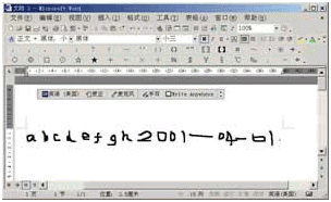 安裝成功后,你會(huì)從圖16中看到一個(gè)手寫(xiě)圖標(biāo),接下來(lái)我們就可以使用手寫(xiě)識(shí)別功能啦。首先,你必須在屏幕上選定書(shū)寫(xiě)區(qū)域,可以是屏幕上類(lèi)似于筆記本橫格紙的輸入板,也可以在屏幕上任意的位置書(shū)寫(xiě)。我們可通過(guò)使用手寫(xiě)輸入設(shè)備或移動(dòng)鼠標(biāo)墊上的鼠標(biāo)來(lái)形成文字,從而完成書(shū)寫(xiě),手寫(xiě)文字將被自動(dòng)識(shí)別,并輸入到程序的插入點(diǎn)處。就像通常在紙張表面上一樣,你可以使用草書(shū)、印刷體或二者兼而有之地進(jìn)行書(shū)寫(xiě),書(shū)寫(xiě)時(shí)不必每寫(xiě)完一個(gè)字母后作停頓,可輸入整個(gè)單詞并在單詞之間留出空格。