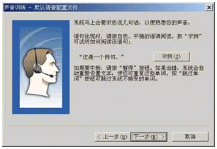 點(diǎn)擊"下一步"按鈕后,你會(huì)看到如圖9所示的對(duì)話(huà)框,這里主要是告訴你系統(tǒng)即將要求你說(shuō)出幾句話(huà)以便熟悉你的聲音,點(diǎn)擊"示例"按鈕后可以試聽(tīng)如何閱讀該語(yǔ)句。