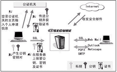 簡單來說,PKI就是由發(fā)布機構(gòu)發(fā)布證書給PKI的用戶,證書中含有用戶公共密鑰和個人密鑰的信息,由證書、證書授權(quán)機構(gòu)CA和實體三部分組成。PKI的用戶利用個人密鑰簽發(fā)信息或解密收到的信息,而其他用戶則使用對應(yīng)公共密鑰收發(fā)信息;赑KI的設(shè)計,采用統(tǒng)一的證書分配、管理策略以及共同的可靠性驗證機制,一方面可以保證E-mail的安全性,另一方面還可以解決現(xiàn)有不同系統(tǒng)無法進行通信的弊病。因此,現(xiàn)有推出的一些優(yōu)秀E-mail系統(tǒng)如3R Soft推出的@SECURE都是基于PKI進行設(shè)計的。通過數(shù)據(jù)加密的辦法只能保證郵件的機密性,卻無法完全保證郵件的完整性和不可抵賴性,即不能保證郵件在傳輸過程中不被他人篡改,且不被人冒名頂替發(fā)送。數(shù)字簽名可以有效地阻止這一現(xiàn)象,即在發(fā)送E-mail的同時,加上一個Hash冗余信息。發(fā)送者使用Hash函數(shù)創(chuàng)建信息的摘要,作為信息數(shù)字指紋,然后用個人密鑰加密信息摘要,加密后的信息摘要就是數(shù)字指紋。目前較為常用的,如在 @SECURE 中采用的MD5算法,它是一種單向散列算法,大小為128比特,經(jīng)計算,它被仿制的概率小于1/265,符合安全性的需要。