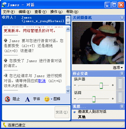 單擊對話框右邊的“啟動攝像機(jī)”和“開始交談”,系統(tǒng)會提示你正在等待對方回應(yīng)視頻或語音對話的邀請,對方接受,就開始進(jìn)行視頻通話(見圖11)。如果雙方都有攝像頭,你還可以通過視頻框下面的“選項”將自己的影像設(shè)為畫中畫的功能。