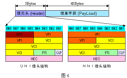ATM信元實際上就是分組,為區(qū)分X.25分組(Packet)改稱為信元(Cell)。ATM信元具有固定的長度,總長為53字節(jié)。其中前5個字節(jié)為信頭(Header),包含各種控制信息,包括信元目的(邏輯)地址、糾錯碼、業(yè)務(wù)控制和維護(hù)信息等;后面48字節(jié)為信息字段(Payload),又稱凈荷,其中包含了業(yè)務(wù)的數(shù)據(jù),它們將被透明地傳輸。信元結(jié)構(gòu)如下圖6所示。在UNI接口和NNI接口上ATM的信元頭結(jié)構(gòu)是不同的。