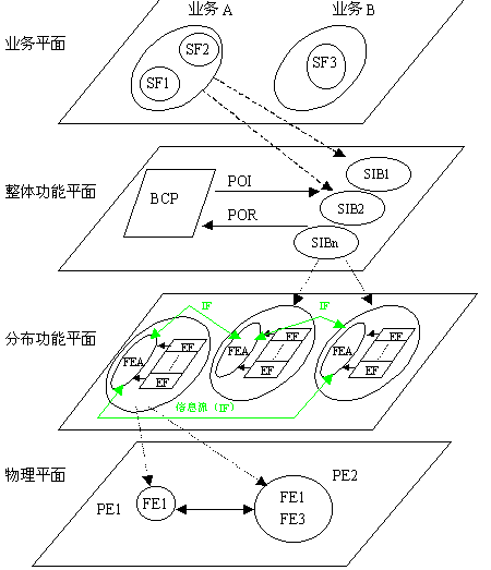 分布功能平面描述了每個SIB的功能是如何完成的。每個SIB包含三種元素:功能實(shí)體動作(FEA)、功能實(shí)體(FE)、功能實(shí)體之間的信息流(IF)。其中每個功能實(shí)體包含有若干個功能實(shí)體動作。下圖是ITU-T定義的分布功能平面模型: