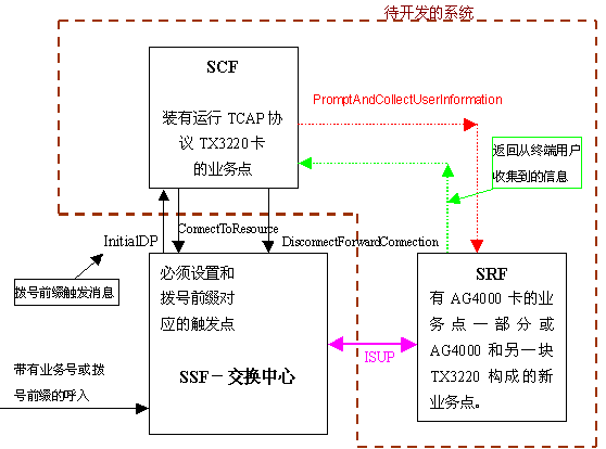 SCF同時(shí)向SRF發(fā)出PromptAndCollectUserInformation指令(紅色虛線)讓SRF播放錄音提示并收集終端用戶(hù)的輸入信息(個(gè)人標(biāo)識(shí)和被叫號(hào)碼)。