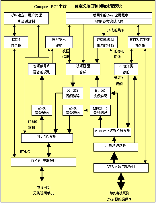 總線。T1/E1中繼和有線電視的接口模塊可以合并,包括其中必須的視頻和音頻處理。但是,用于Compact PCI系統(tǒng)的、新的、高帶寬的交換結(jié)構(gòu)使得把這些功能分離成不同的模塊成為可能,免除媒體通過PCI總線的必要。