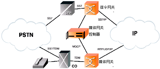 IP電話技術(shù)把話音、傳真數(shù)據(jù)和IP網(wǎng)絡無縫地集合到了一起。因特網(wǎng)工程任務組(IETF)已經(jīng)建議了一個功能模型,來橋接包交換的IP網(wǎng)和電路交換的PSTN,這些橋接設備就是:信令網(wǎng)關(guān)(SG)、媒體網(wǎng)關(guān)(MG)、和媒體網(wǎng)關(guān)控制器(MGC)。(請參看圖1)。MGC通常又被叫做軟交換,正如它的名字表達的意思一樣,MGC控制著媒體從電路交換領(lǐng)域經(jīng)過媒體網(wǎng)關(guān)的網(wǎng)絡傳送到基于包的領(lǐng)域。呼叫控制消息首先送達SS7信令網(wǎng)關(guān),轉(zhuǎn)換成網(wǎng)關(guān)網(wǎng)絡中的MGCP(媒體網(wǎng)關(guān)控制協(xié)議)來控制媒體流,完成呼叫的控制、接續(xù)。話音、傳真和圖象介質(zhì)都是從PSTN交換網(wǎng)通過這些新一代的媒體網(wǎng)關(guān)連接到IP網(wǎng)的。