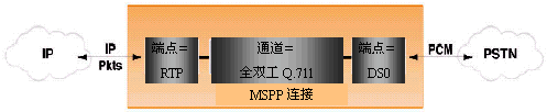 MSPP通道可以是全雙工語音編碼器、傳真轉(zhuǎn)發(fā)編碼器、或者是各種單工通道。在一個普通VoIP網(wǎng)關(guān)應用中,一個端點就是一個和PSTN連接的DS0,PSTN連接最常見的是CG6000系列平臺上的T1或E1接口,也可能是T3接口。其它連接是一個通過以太網(wǎng)接口連接到廣域包網(wǎng)絡(WAN)的RTP話音包端口。通過指定端點和通道類型,很容易開發(fā)出各種包電話應用。