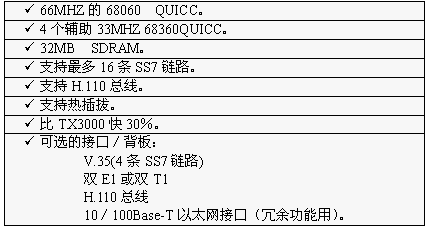TX3000在新版軟件中可以支持冗余功能,冗余功能可以使系統(tǒng)能檢測并恢復以下各種故障:TX SS7板上的鏈路故障,信令點故障,或者是TX SS7板本身的故障。每對冗余TX3000卡通過一條專用以太網(wǎng)交叉電纜相連接,別的卡或設備不能連接到這一專用以太網(wǎng)連接上。TX3000的主要特性如下表所示: