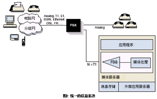 圖2是有前提的典型統(tǒng)一消息拓?fù)鋱D。這個例子中媒體服務(wù)器管理消息的存儲和提取,這些消息包括語音、傳真、數(shù)據(jù)或視頻。它可以訪問不同媒體文件以及必要的控制規(guī)則以實現(xiàn)各類媒體業(yè)務(wù)?梢栽诒镜氐拿襟w服務(wù)器上也可以在遠(yuǎn)程的集中存儲系統(tǒng)上進(jìn)行存儲。在這種情況下,能提供語音和傳真資源的統(tǒng)一的消息系統(tǒng)通常和email系統(tǒng)比如微軟的Microsoft