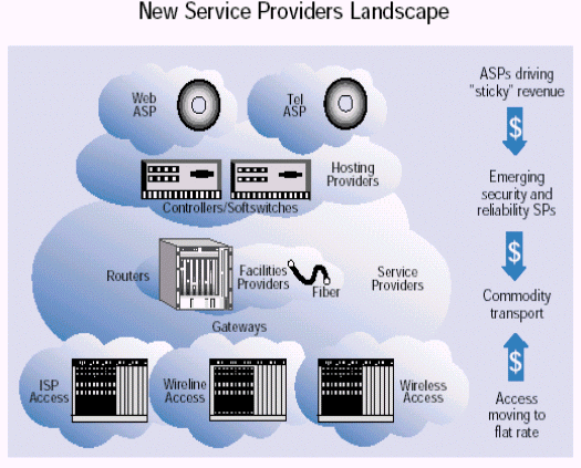 任何一個網(wǎng)絡(luò)的核心都是光纜和讓網(wǎng)絡(luò)工作起來的底層交換設(shè)備。傳統(tǒng)的業(yè)務(wù)提供商就是那些擁有這種底層設(shè)備的公司。但是打破傳統(tǒng)的語音環(huán)境為那些沒有這些底層設(shè)備的組織打開了向商業(yè)客戶和消費者提供服務(wù)的大門。這種趨勢--網(wǎng)絡(luò)傳輸從電路交換轉(zhuǎn)變?yōu)榉纸M交換以及隨時可得的基于開放部件的劃算的業(yè)務(wù)平臺--使得這些新的業(yè)務(wù)提供商為自己的業(yè)務(wù)找到了商業(yè)機遇。