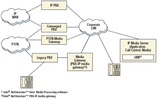 IP座席和IP媒體服務器連接到內部網. 公司內部網可以通過PSTN-IP媒體網關來連接PSTNA. 企業(yè)內不斷增加的使用VoIP技術的需求使IP媒體服務器的需求也不斷增加.